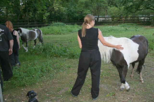 Gott sein Dank hatten wir unsere Tierheilpraktikerin Susi dabei die mit der Hilfe von Tamara, die zwei wilden Indianerponys mit Streicheleinheiten im Zaum hielt.