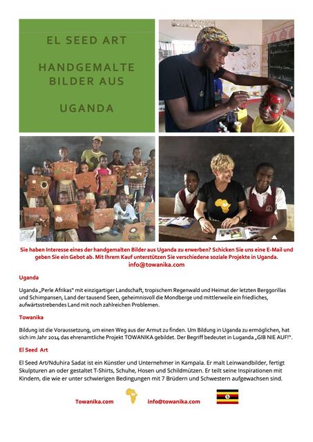 Während Allan Mutagwaba vom Cafe MAK aus Augsburg selbstgerösteten Kaffee von den Plantagen seiner Familie in Tansania zubereitete, berichtete die Augsburgerin Brigitte Ross über Ihr Projekt Towanika. Towanika bedeutet auf Luganda „Gib nie auf“. Mit Ihrem Projekt unterstützt sie soziale Projekte in Uganda. Aktuell bietet sie einige handgemalte Bilder von der El Seed Art Foundation an, die gegen Gebot erworben werden können. Wer Interesse an einem der Bilder hat, darf gerne unter info@towanika.com ein Gebot abgeben. Der Erlös fließt zu 100 % an Towanika und die El Seed Art Fondation.