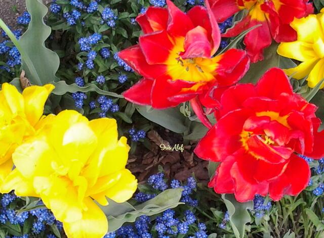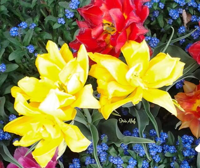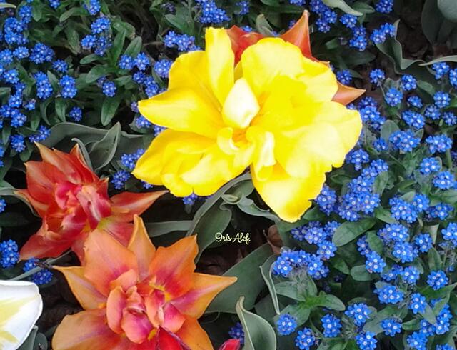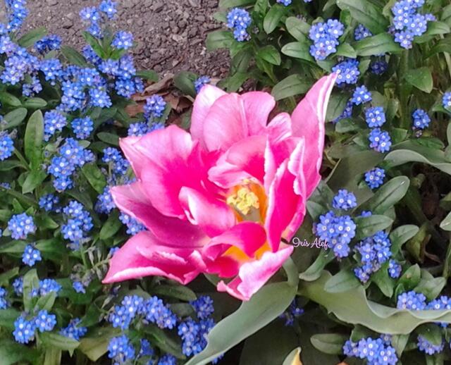 Doppelte Tulpen mit blauen Vergissmeinnicht im vergangenen Jahr im Botanischen Garten fotografiert.