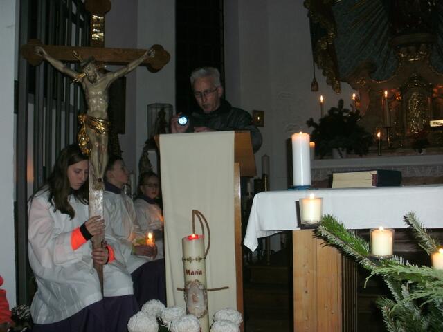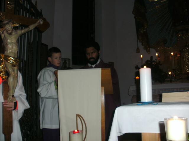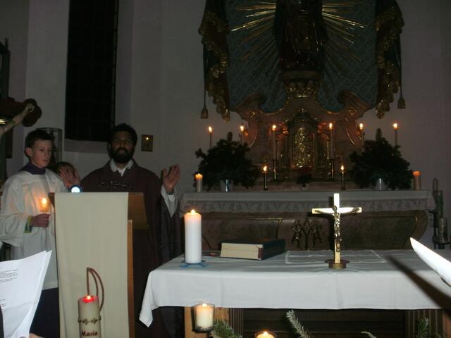 Über hundert Pilger aus der Pfarreiengemeinschaft Meitingen machten sich auf Einladung der KAB Ortsgruppe Meitingen am 12. Dezember mit Bussen und Privatautos auf den Weg nach Maria im Elend. Singend und betend zogen sie als Prozession mit Fackeln und Kerzen durch den Wald. Der KAB Ortspräses Pfarrer Johnson Puthuva zelebrierte in der restlos vollbesetzen Kapelle den Gottesdienst, musikalisch gestaltet von Ryan McKown und Adolf Bier. Das Vorstandsteam der KAB hatte das Thema Frieden gewählt. Es wurde für den Frieden im Kleinen - den Familien, Gerechtigkeit am Arbeitsplatz - und für den Weltfrieden gebetet.