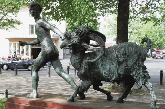 Auf der Nordhälfte zieren die zwei spiegelgleichen Bronzeskulpturen "Knabe mit Ziege" von August Kraus den Platz. Auf der Südhälfte des Platzes ließ 1905 der U-Bahn-Architekt Alfred Grenander einen Kiosk errichten, der 1987 rekonstruiert wurde und inzwischen unter Denkmalschutz steht. Text und Foto: Klaus Tolkmitt