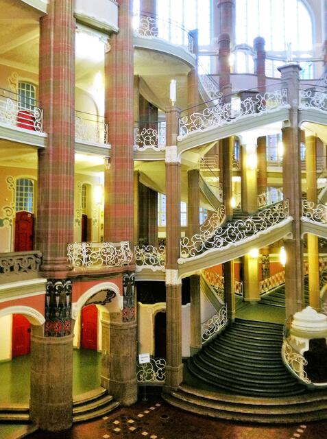 Von außen noch eher unscheinbar, eröffnet sich innen ein architektonisches Bauwerk von prachtvoller Schönheit. Trotz der Dimension wirkt der „Justizpalast“, wie das Gerichtsgebäude auch gern genannt wird, nicht wirklich pompös. Herzstück der fast kreisrunden Halle sind die Zwillingswendeltreppen, die die Etagen verbinden und von jeder Etage den Blick in den Eingangsbereich freigeben.