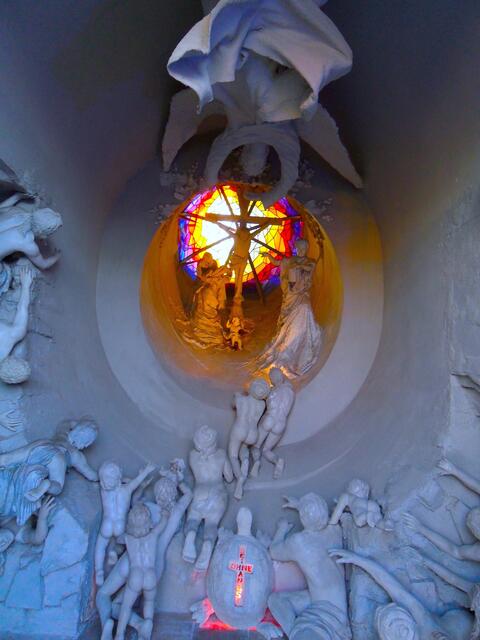 Immer dann wenn Frau Kriesche Zeit gehabt hätte, sich auf den Weg zur Erlöserkapelle zu machen, gab es keine Sonnentage und wenn es kurzfristig Sonnentage gab, hatte Frau Kriesche andere Verpflichtungen. So vergingen Monate um Monate. Daß aber die Monate vergingen war letztlich von Vorteil, denn in der Zwischenzeit wollte der Künstler eine weitere Figur im Innenraum der Kapelle gestalten: einen großen Engel an der Decke. Somit war die Erlöserkapelle im Jahr 2015 eine Baustelle, weil auch die Figuren in den Seitennischen umgestaltet und das Spiegelsystem umgewandelt wurden. Mittlerweile liegt die Erlöserkapelle auf dem Europäischen Pilgerweg (mit Pilgerstempel).