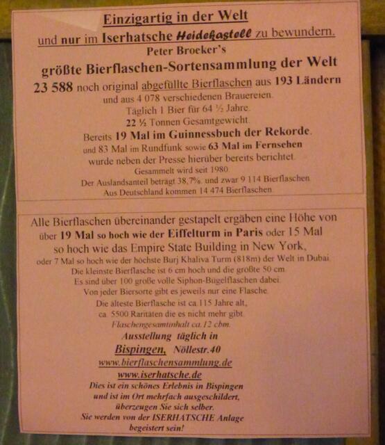 Einen weiteren Punkt auf meiner "Möchte-ich-gesehen-haben"-Liste habe ich nun auch abhaken können. Wie soll man das "Heidekastell Iserhatsche" beschreiben? Nun ja, es ist................................. Ich kam mit einem Ehepaar ins Gespräch und die Frau meinte, sie wäre schon mal hier gewesen, aber ihr Mann noch nicht und sie wolle ihm das halt mal zeigen. Mir empfahl sie, unbedingt die Führung mitzumachen. Ich wäre hinterher sprachlos! JAWOLL! So war es dann auch! Eigentlich kann man das...