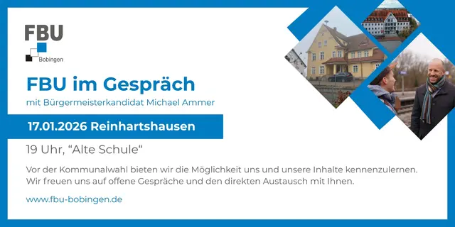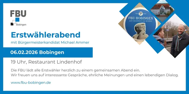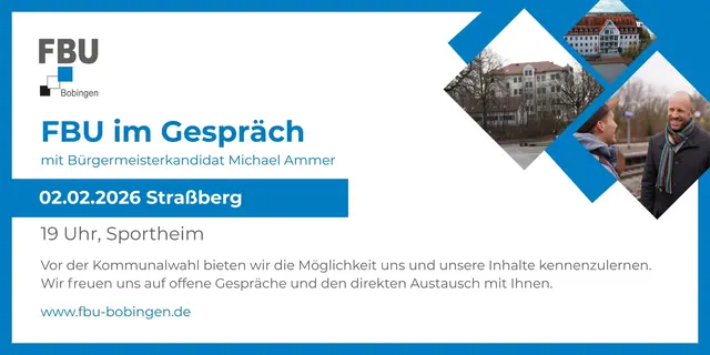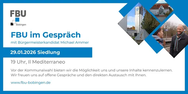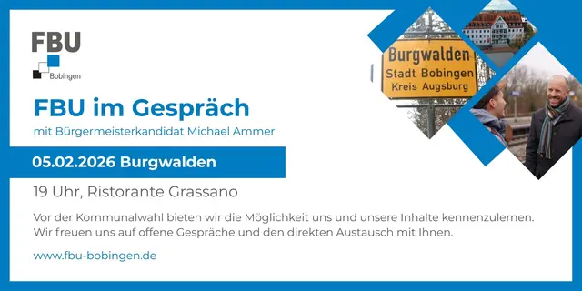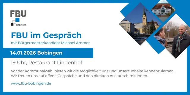 Mit regelmäßigen Berichten aus dem Stadtrat und unserem "FBU-Monitor" schaffen wir größtmögliche Transparenz über unsere politische Arbeit und unsere Anliegen. Wir setzen uns ein für Themen wie Umwelt und Nachhaltigkeit, Wohnraum, Stadtentwicklung, Verkehr und Nahmobilität, wirtschaftliche Entwicklung und Gewerbe sowie für Bürgerbeteiligung und öffentliche Infrastruktur. Entscheidungen werden bei uns auf sachlicher Grundlage und mit Verantwortung getroffen. Dabei haben wir stets das Wohl aller Bürgerinnen und Bürger Bobingens im Blick.