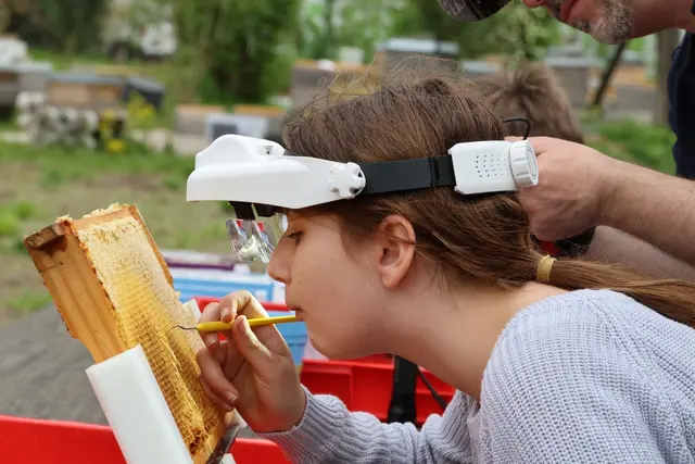 Dabei wurden winzige Bienenlarven - gerade einmal 1 bis 3 Millimeter groß - mithilfe eines speziellen "Umlarvlöffels" und unter der Lupe vorsichtig aus ihren Zellen entnommen und in vorbereitete Zuchtnäpfe umgesetzt. Eine ruhige Hand, Geduld und Respekt vor den Tieren waren hier gefragt .. und genau das haben die jungen Imkerinnen und Imker eindrucksvoll gezeigt.