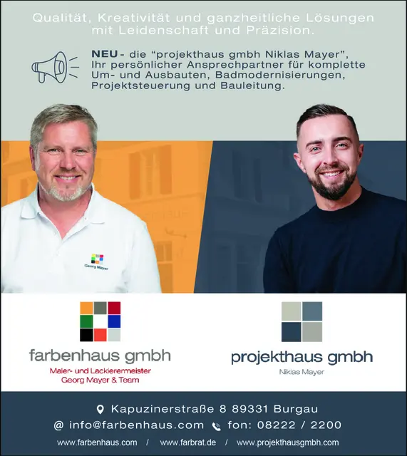 Der farbrat & Maler- und Lackierermeister Georg Mayer aus Burgau hat mit der farbenhaus GmbH einen beeindruckenden beruflichen Weg zurückgelegt. Von einer Ein-Mann-Firma hat sich sein Unternehmen zu einem renommierten farbenhaus entwickelt. Hinter der farbenhaus GmbH stehen Profis und Facharbeiter, die ihr Handwerk verstehen und leben. Nicht nur die Anzahl der Mitarbeiter um Georg Mayer ist massiv angestiegen, sondern auch die Verkaufs- und Präsentationsräume wurden ständig erneuert und...