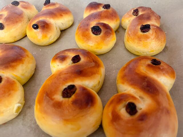 Am Vortag wurden frische „Lussekatten“ nach schwedischem Originalrezept gebacken und sorgfältig gerollt und bestrichen.