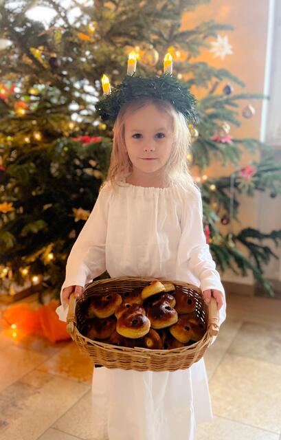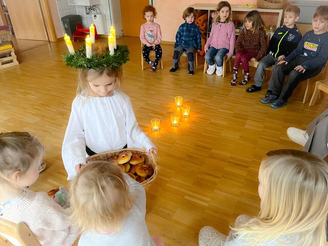 Die Vorschulkinder trugen unter besinnlichem Gesang Kerzen in die Mitte des Kreises. Am Ende dieser „Lichterkette“ erschien Lucia mit Kerzenkrone im hell erleuchteten Kreis, die Hände voll mit einem großen Korb Gebäck. Andächtig teilte sie die Lussekatten an alle Kinder aus.