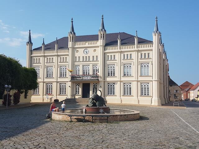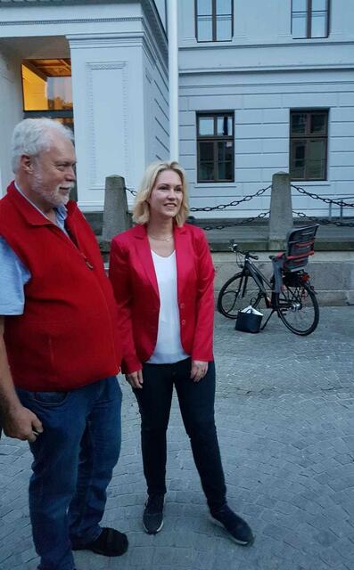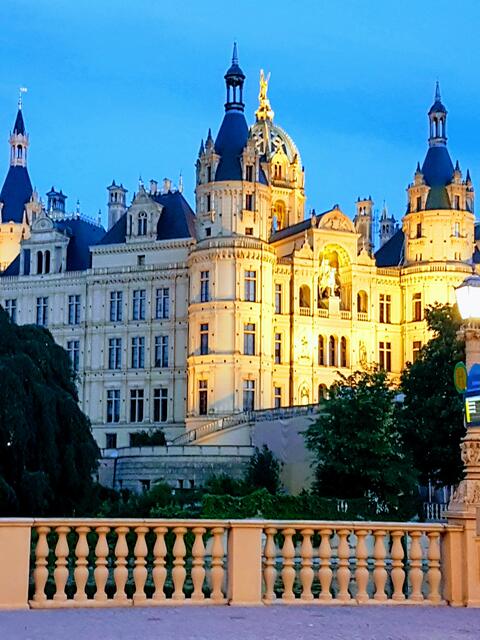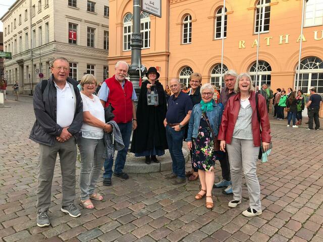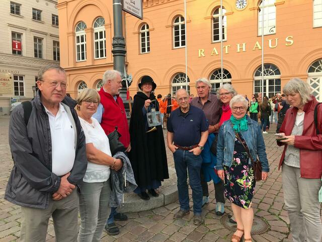 - Erfolgreich in der Abenddämmerung: Ministerpräsidentin Manuela Schwesig (2.v.r) und Nachtwächterin Anja Engelmann (kniend) wünschen - direkt vor der Staatskanzlei (rechts) in Schwerin - den "Himmelsradlern" aus Berlin, Romrod, Osterode und Langenhagen gutes Radfahren in Mecklenburg-Vorpommern. Der Fotograf dieses Bildes ist auf dem nächsten Bild ganz rechts mit drauf.