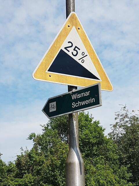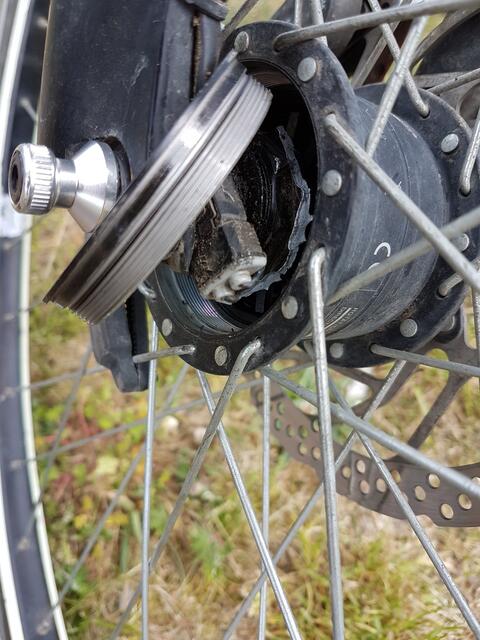 Nabendynamo-Gehäuse vorn gebrochen/blockiert: Nur mit viel Glück und durch gerade ausreichendes eigenes Gewicht nicht über den Lenker geflogen. Zurücktransport 30 km nach Schwerin mit der ADFC-Pannenhilfe.