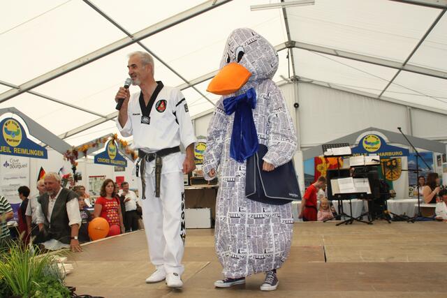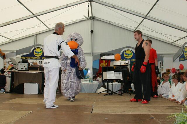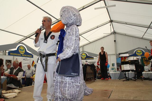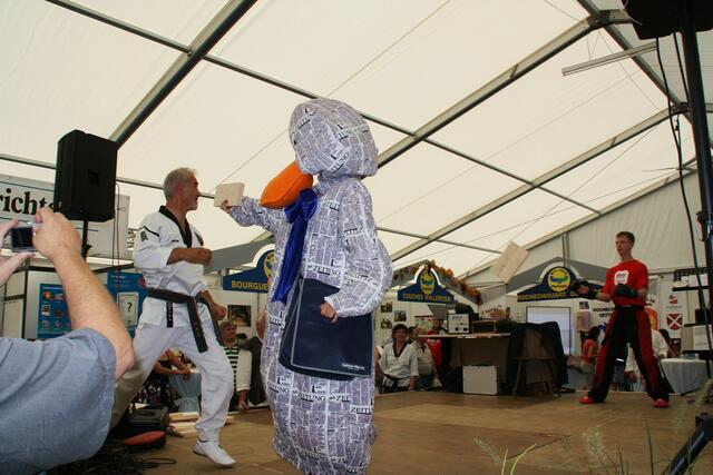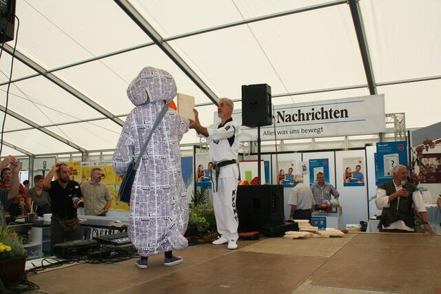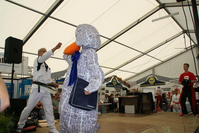 assistietre mir bei unserer Kampfsport-Vorführung auf der Bühne der Rieser-Nachrichten. Sie musste mit ihren zarten Händen ein 3 cm starkes Brett halten, und ich habe mit der Innenhandkante zugeschlagen. Ein Schüler von mir stellte sich gegenüber, um das Brett aufzufangen. Ich durfte weder fest noch schwach schlagen. Das Ergebnis: optimale Dosierung (letztes Bild). Anschließend gingen wir in ein Versteck, um für die Zeitung "Enten zu produzieren"! :-)))