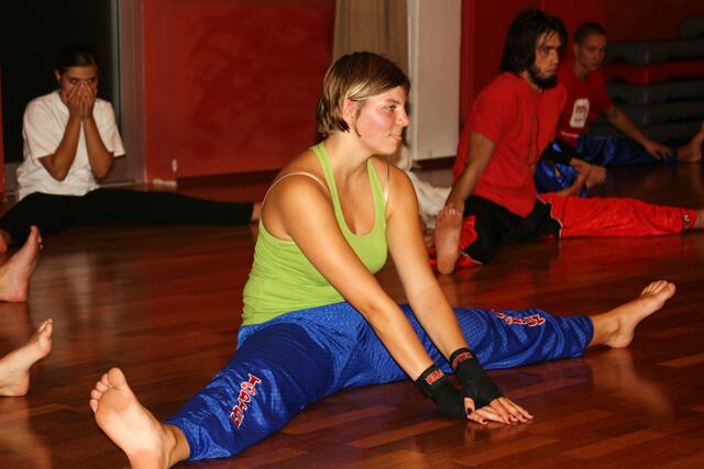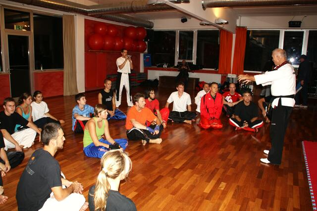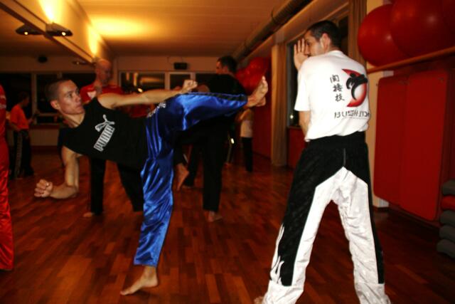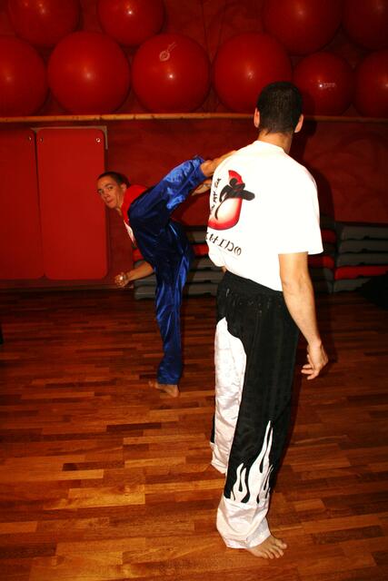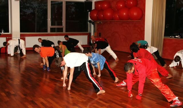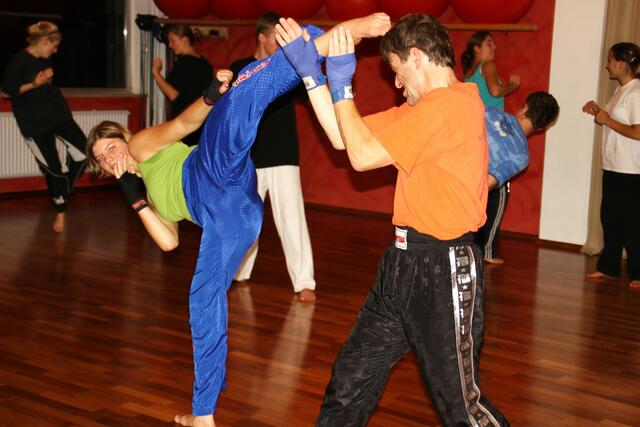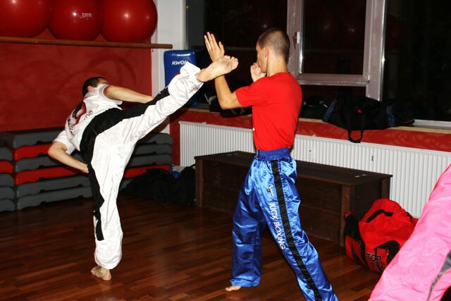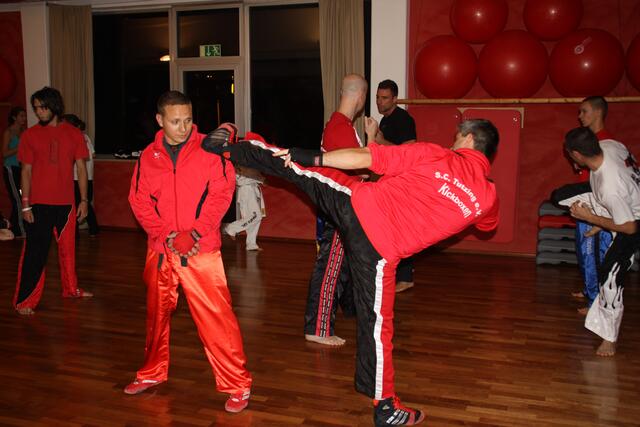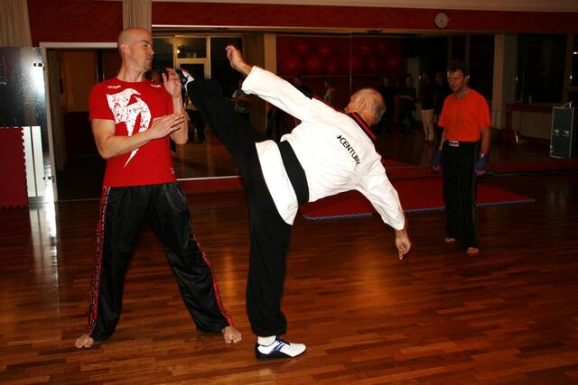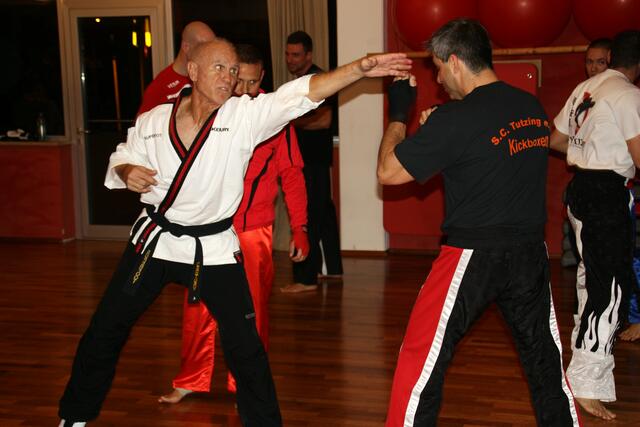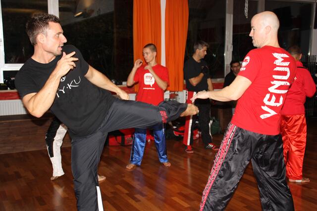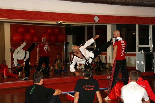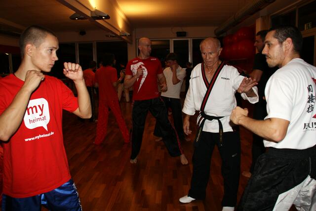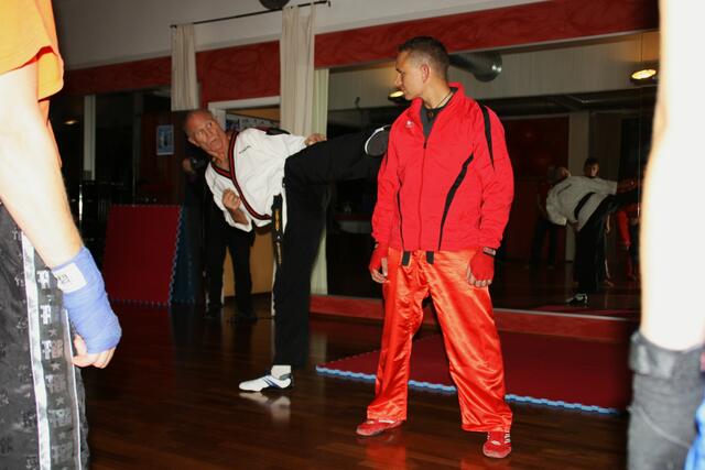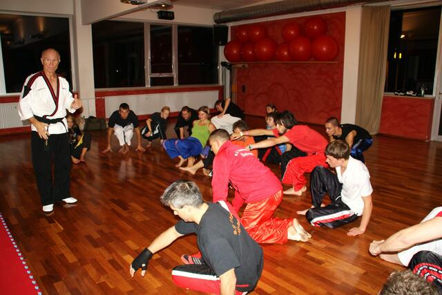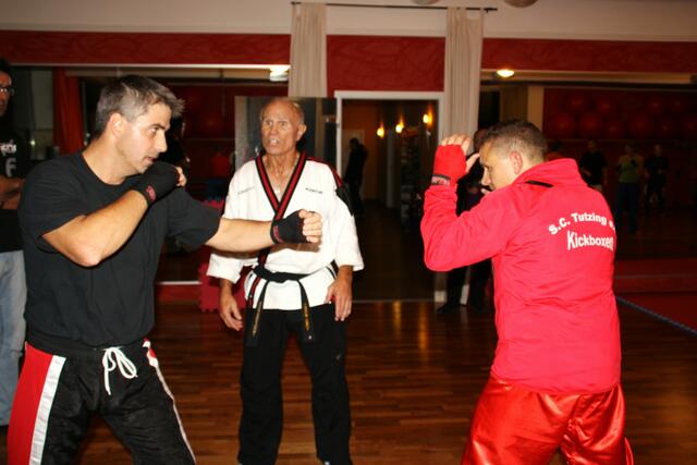 Mit ein bisschen Verspätung kamen wir in Penzberg an. Sie hatten gerade mit Aufwärmen und Stretching angefangen. Bill zeigte brillante Fußtechniken, teuschen, Faustkombinationen und Taktik. Er erklärte gleichzeitig, daß diese Techniken seine Techniken seien und jeder für sich seine eigene Technik finden muss. Bei diesem Anlaß konnte ich auch Freddy Kleinschwärzer treffen, der zu diesem Lehrgang auch gekommen war.