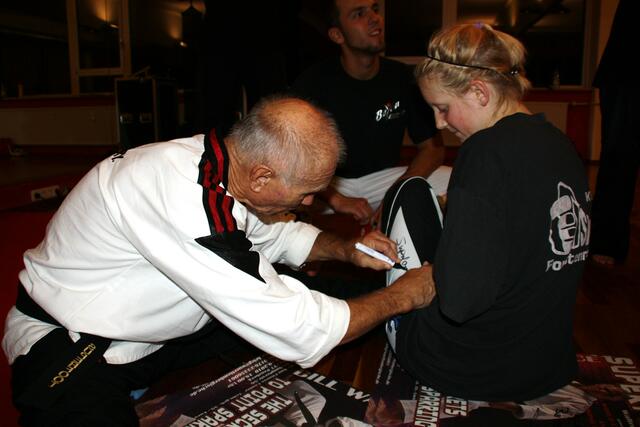 Am Ende des Lehrgangs wurden noch Gruppenfotos gemacht und Autogramme vergeben. Anschließend gingen wir in Penzberg in ein Restaurant zum Essen und unterhielten uns mit Bill, um Näheres über ihn und seinen Sport zu erfahren. Ein fröhlicher, lustiger und sehr interessanter Mensch, der seinen Titel 23 mal verteidigt hatte, wie er es erzählte. Nach eingen Stationen, wie Lindau Frankfurt und Dortmund fliegt er wieder nach Amerika zurück.