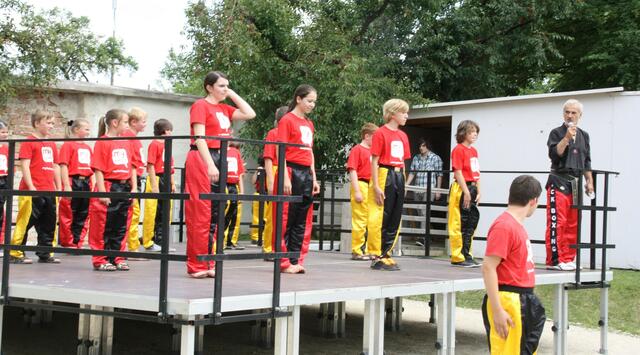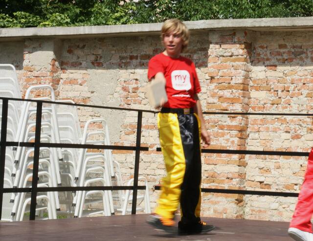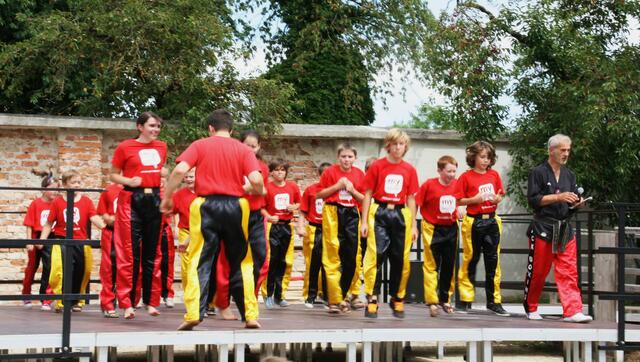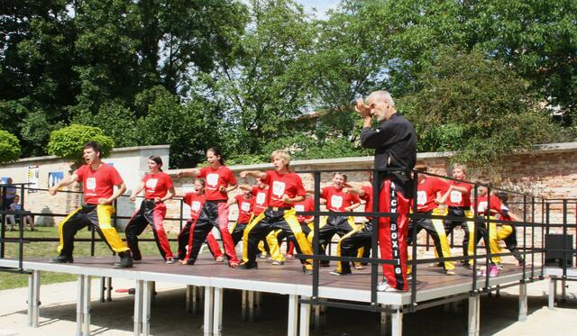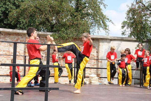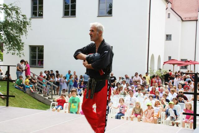An einem wunderschönen Sommertag waren einige Vereine und der TSV Rain Abt. Taekwon-Do beim Kinder- und Familienfest im Schlossgarten in Rain am Lech eingeladen. Die Kinder und meine Wenigkeit mussten in einer halben Stunde einen Querschnitt von unserem Programm in Sachen Kampfsport darbieten. Es waren an die 22 Kampfsportler, darunter drei aus Meitingen. Da die Schüler um 15:30 Uhr auftreten müßten, war die Bühne von der Sonne so aufgeheizt, daß sie sich fast die Füße verbrannten. Ich sagte ihnen sie müssen ihre Schuhe anziehen. Trotzdem bekamen einige Brandblasen an den Füßen. Die Kampfsportler zeigten aus den Kampfkünsten Taekwon-Do, Allkampf-Jitsu und Kickboxen. Nach einer kurzen Gymnastik von Fabian E. (2. Dan Taekwon-Do), der Begrüßung, Erleuterung über die Kampfsportarten und Trainingszeiten begannen sie mit Formen, Bruchtest, Selbstverteidigung und Freikampf. Anschließend bedankten wir uns nocheinmal bei der Stadt Rain für die Einladung und bestätigten, daß es eine schöne Veranstaltung war und wir nächstes Jahr wieder dabei sein werden.