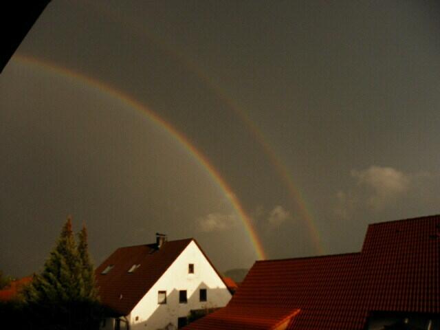 Was für ein seltenes Bild am Himmel hat sich mir heute geboten. Zuerst war nur einer zu sehen, bis ich aber meine Kamera geholt habe staunte ich nicht schlecht. Da waren doch tatsächlich zwei Regenbogen zu sehen. Hier meine Bilder von der Beobachtung.