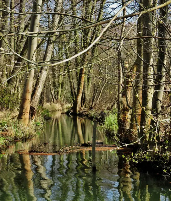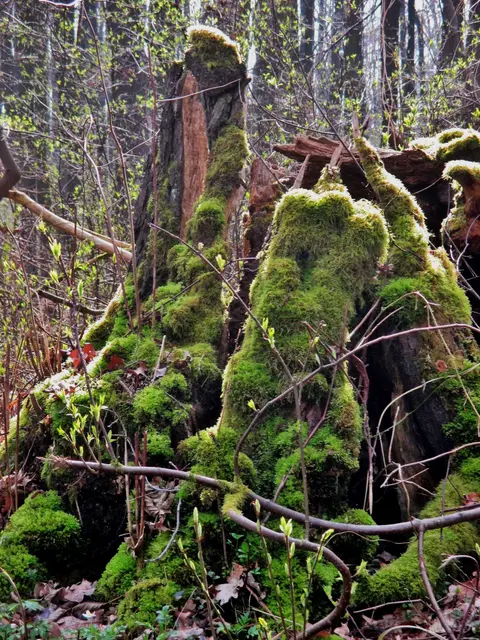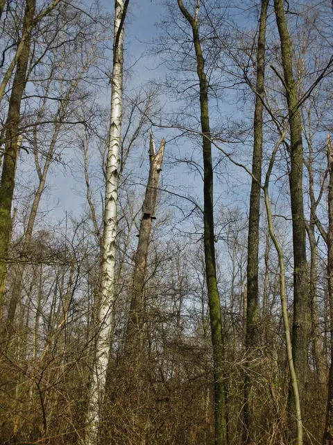 Alte Bäume ragen kerzengerade in den Frühlingshimmel, andere haben den Überlebungskampf aufgegeben und neigen sich der Erde zu.