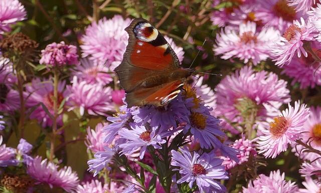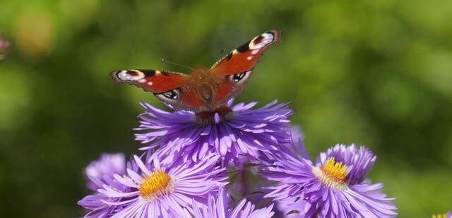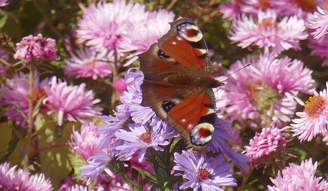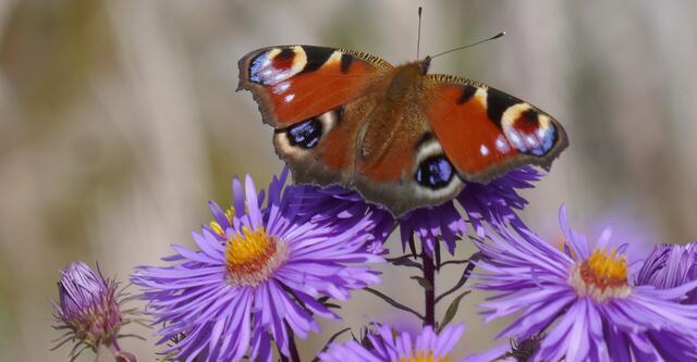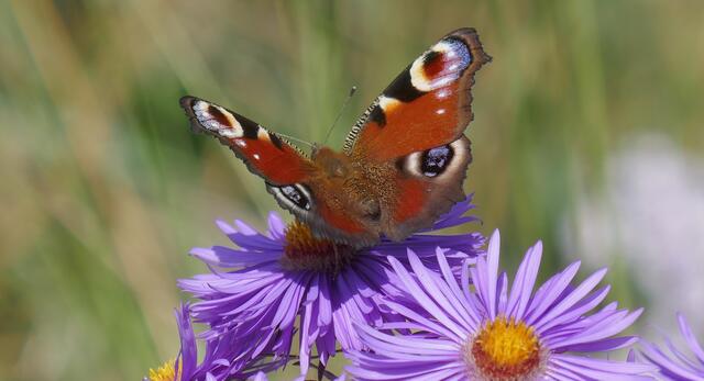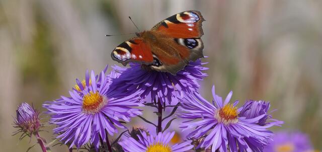 Das Tagpfauenauge ist ein Schmetterling aus der Familie der Edelfalter. Der Artname leitet sich von Io, einer Geliebten des Zeus aus der griechischen Mythologie ab. Das Tagpfauenauge wurde zum Schmetterling des Jahres 2009 gewählt. Astern sind auf der gesamten Nordhalbkugel verbreitet. Sie bevölkert Küstengebiete, Uferzonen, bergige Regionen, lichte Wälder und offene Landschaften und zur Zeit auch große Flächen der Gruga.