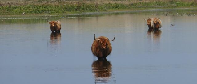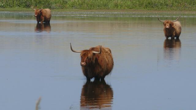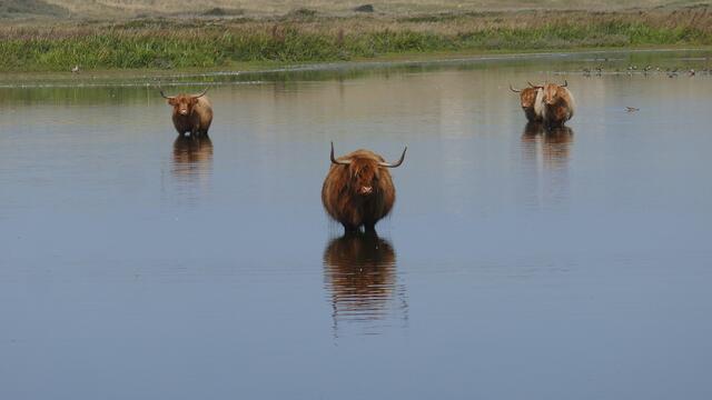Schottische Hochlandrinder sind eine robuste Rinderrasse, die ursprünglich aus den schottischen Highlands stammt. Sie sind bekannt für ihre langen Hörner und ihr langes, zotteliges Fell. Auf Texel gibt es mehrere Gebiete, in denen Schottische Hochlandrinder grasen. Im Naturschutzgebiet De Geul im Süden von Texel sind noch einige schottische Highlander unterwegs. Eine weitere Weidefläche für Schottische Hochlandrinder ist De Bollekamer, wo sie seit 1994 durch Schottische Hochlandrinder und Exmoor Pony’s begrast werden.