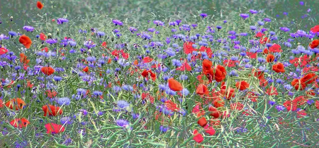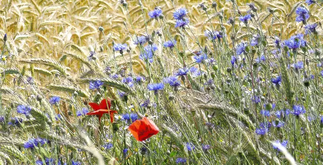 🌾 Getreidegold und Blütenblau 🌺 Im goldnen Feld zur Mittagszeit, wo Ähren rauschen, sanft und weit, da wiegen sich in Farbenpracht zwei Blumen, zart vom Wind bewacht. Die Mohnblume, rot wie Abendglut, verströmt im Wind ihr leises Blut. Ein Tupfer Sehnsucht, still und kühn, im Tanz des Sommers kaum zu fliehn. Daneben Kornblau, kühl und klar, steht stolz die Kornblume ganz und gar. Wie Himmelspunkte zwischen Spreu, ein Hauch von Ewigkeit und Treu. Gemeinsam steh’n sie, wild und frei, im Kornmeer...