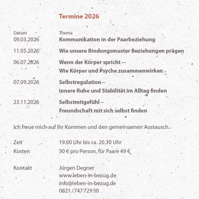 Über das Jahr biete ich in Augsburg eine fortlaufende Reihe von Vorträgen und Workshops an. Im Mittelpunkt stehen Themen aus den Bereichen Paarbeziehung, Lebensgestaltung, Selbsterfahrung und Persönlichkeitsentwicklung.