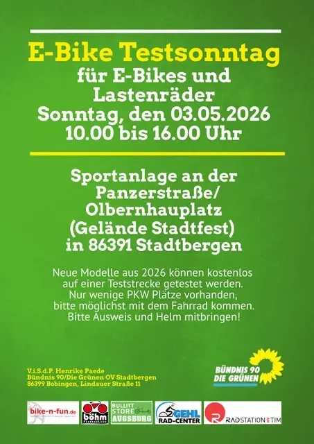 Die Stadtberger Grünen laden herzlich zum alljährlichen Testen von E-Bikes ein, diesmal auch mit Lastenrädern! Bitte Ausweis und Helm mitbringen! https://gruenestadtbergen.de/news/news-details/e-bike-testsonntag-3-mai-2026