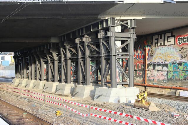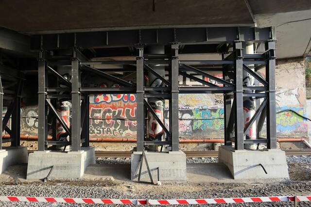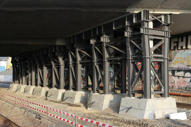 Unter der Straßenbrücke sind rund um die Pfeiler Stahlstützen errichtet worden.