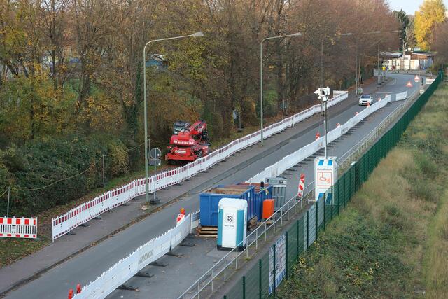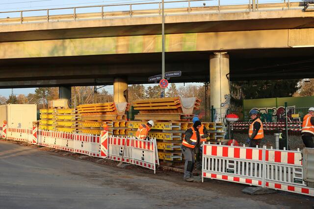 Südlich der Straßbrücke lagerten Teile für Verschalungen auf dem Gehweg.