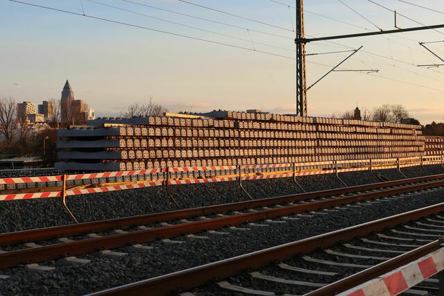 Am südlichen Ende der neuen S-Bahn-Gleise lagerten Schwellen, Gleise und Weichen auf der Bahntrasse. Die neuen S-Bahn-Gleise waren noch nicht Richtung Frankfurt angeschlossen.