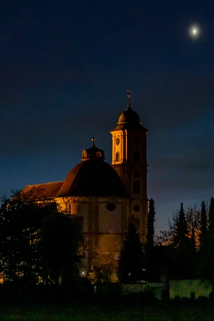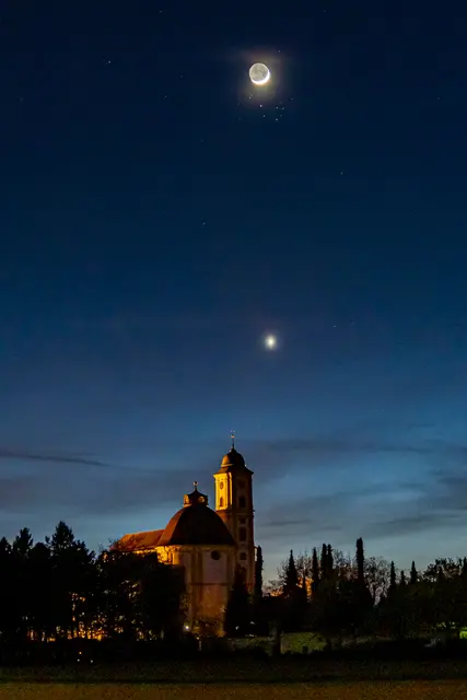 Die Mondsichel in Begleitung der Plejaden und der Venus bei der Wallfahrtskirche Herrgottsruh in Friedberg