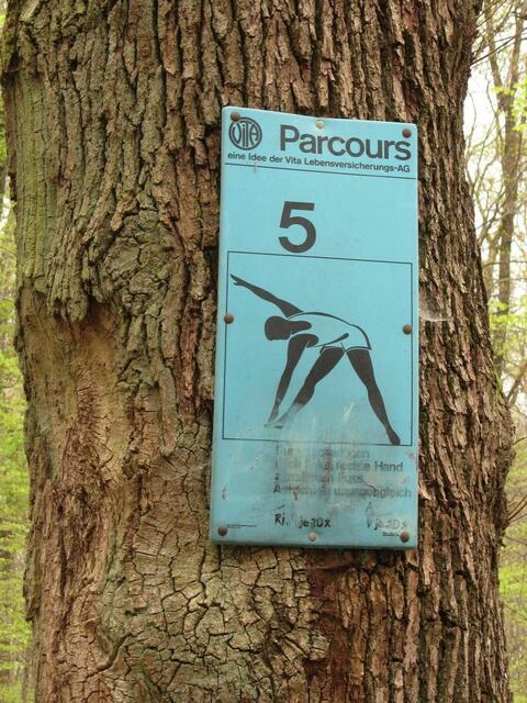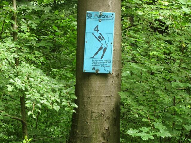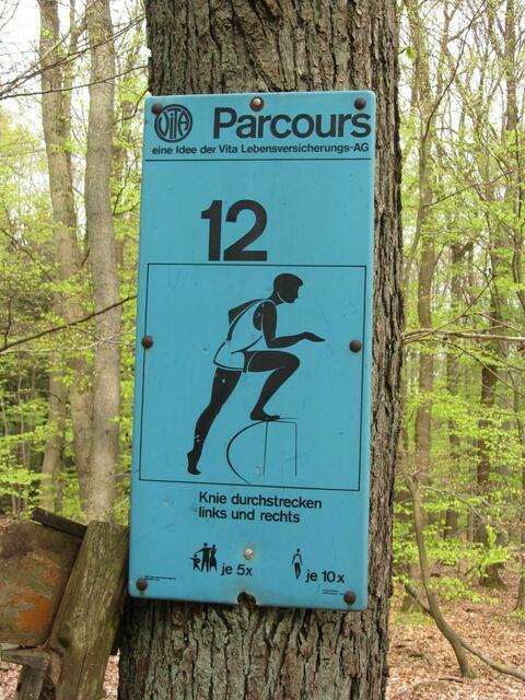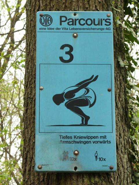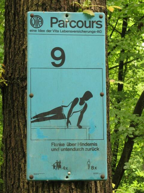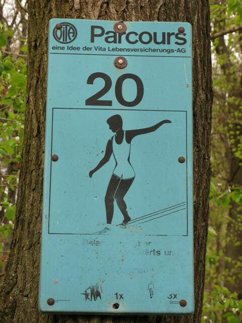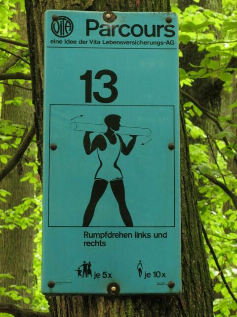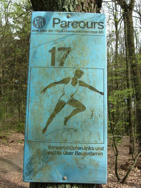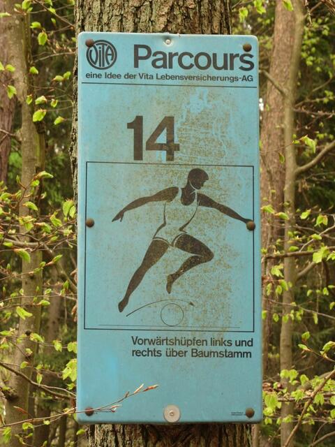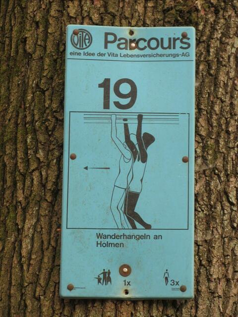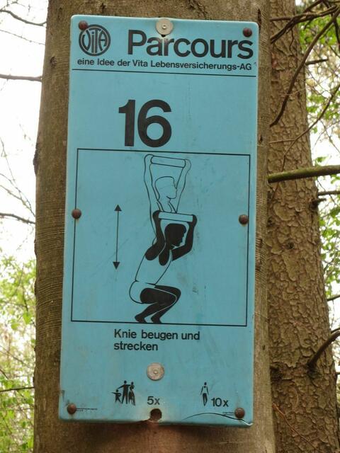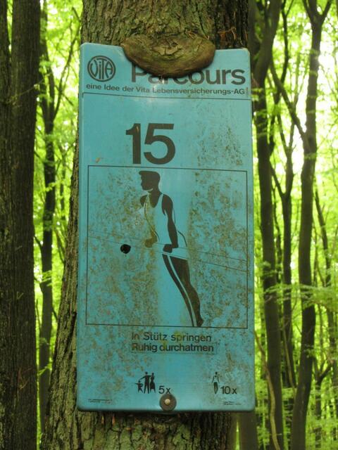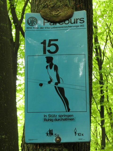 Das Schild von Station 15 ist an der oberen Seite richtig in den Baum, an dem es befestigt wurde, eingewachsen. Unter der Bennenung der Übung "In Stütz springen" wurde nachträglich noch der Text "Ruhig durchatmen" hinzugefügt - weitere Vorkommen dieser Modifikation sind nicht bekannt. Gegenüber von Station 16 befindet sich ein Wegweiser, der ebenfalls eingewachsen ist und dabei ziemlich verbogen wurde. Leider ist er inzwischen durchgebrochen.