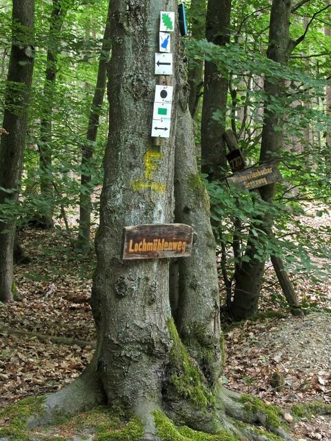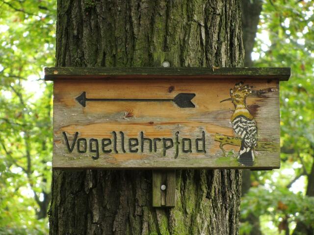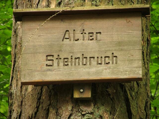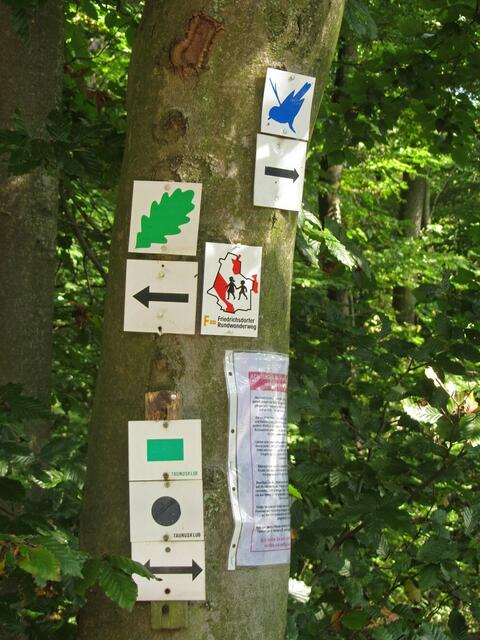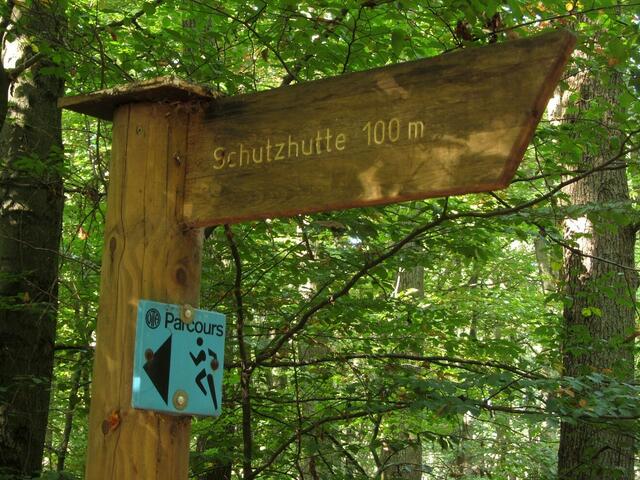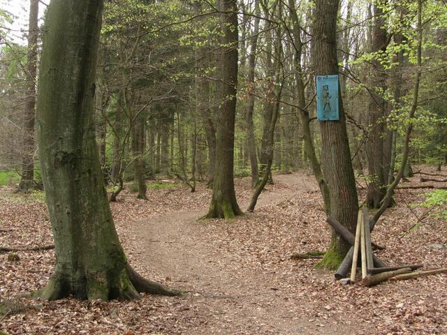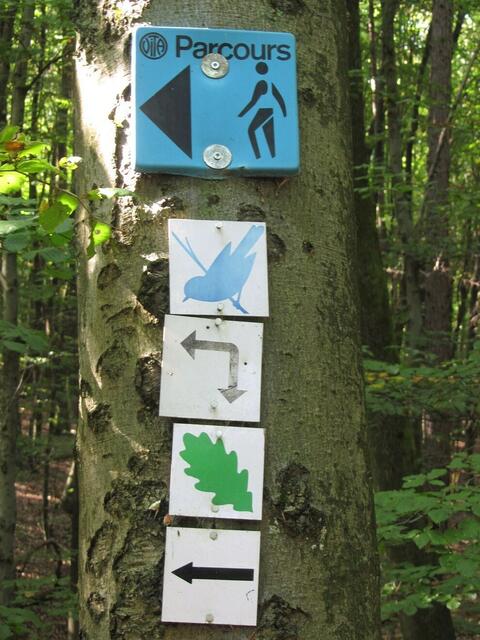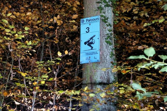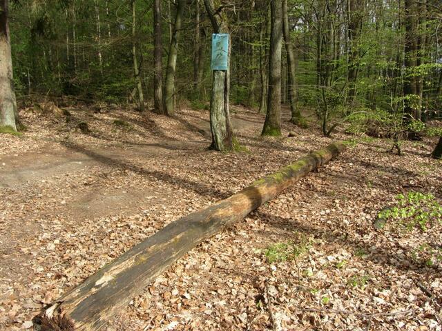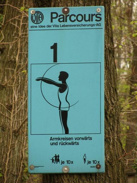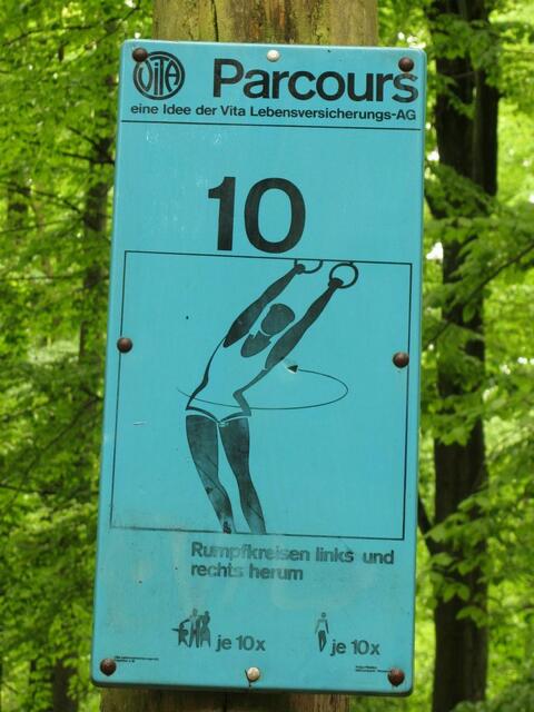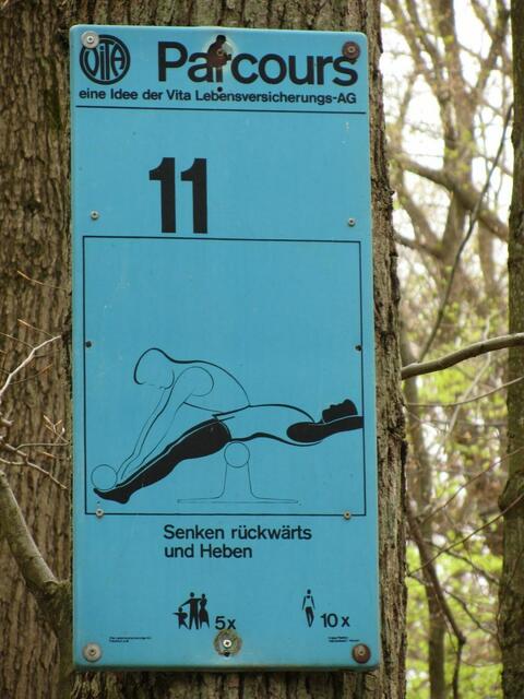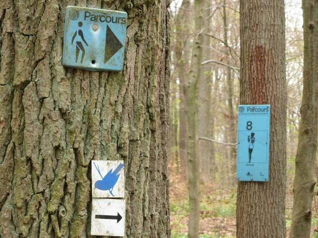 Das Schild von Station 15 ist an der oberen Seite richtig in den Baum, an dem es befestigt wurde, eingewachsen. Unter der Bennenung der Übung "In Stütz springen" wurde nachträglich noch der Text "Ruhig durchatmen" hinzugefügt - weitere Vorkommen dieser Modifikation sind nicht bekannt. Gegenüber von Station 16 befindet sich ein Wegweiser, der ebenfalls eingewachsen ist und dabei ziemlich verbogen wurde. Leider ist er inzwischen durchgebrochen.