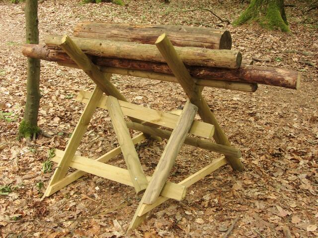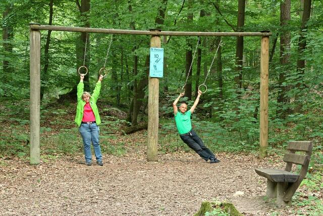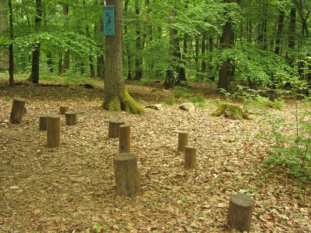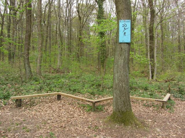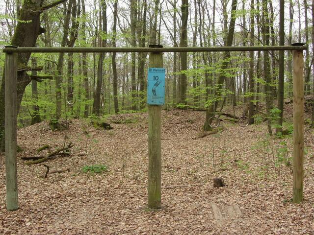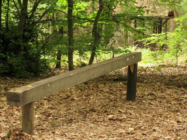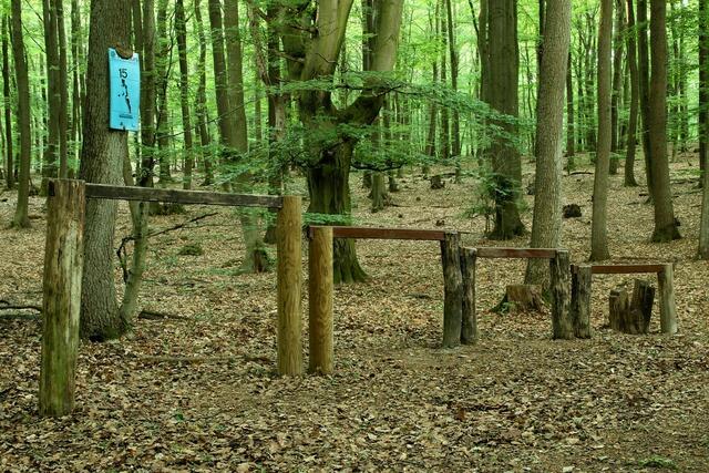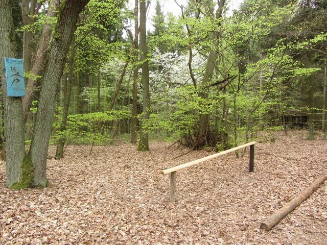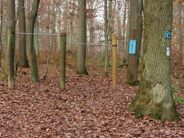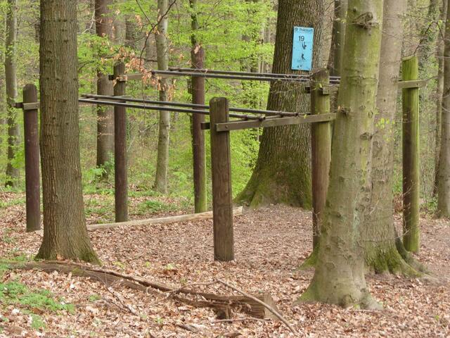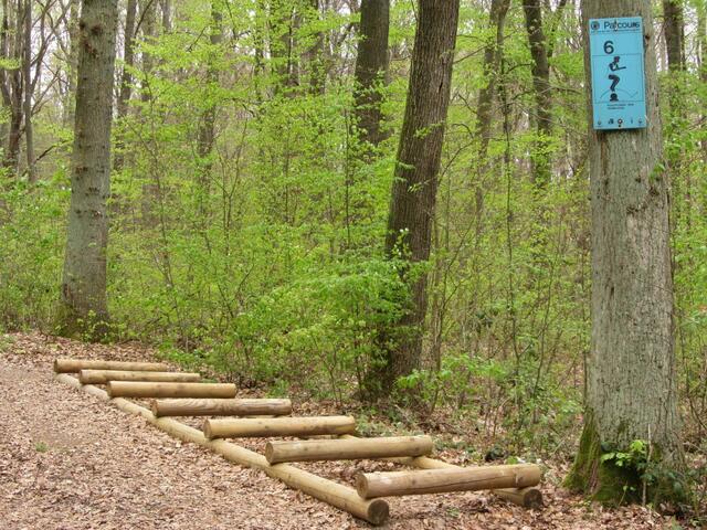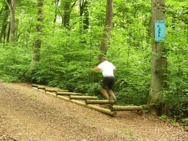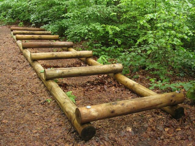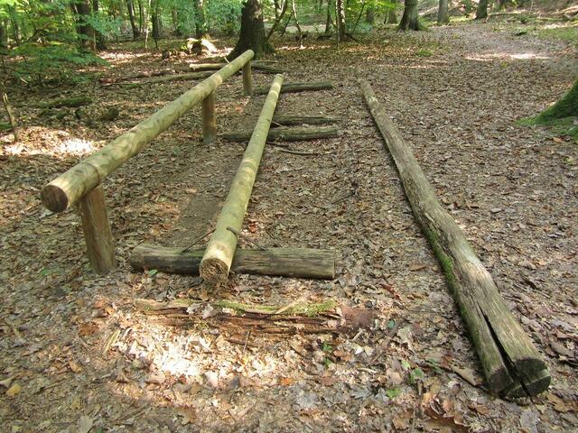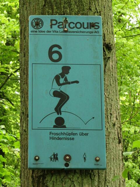 Wie bei jedem Vita-Parcours gibt es das erste Übungsgerät an Station 6, nämlich eine Holzkonstruktion zum Froschhüpfen. Der gute Zustand lässt darauf schließen, dass die Holzteile vor nicht allzu langer Zeit ausgetauscht wurden. Wegen der begrenzten Haltbarkeit von Holz wird man kaum gut erhaltene Übungsgeräte aus der Entstehungszeit der Vita-Parcours finden.