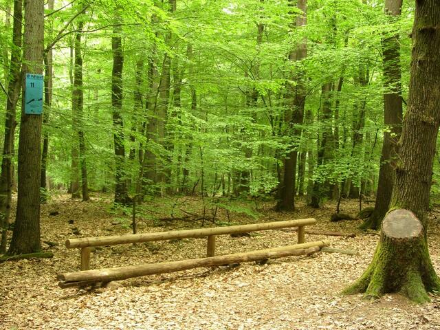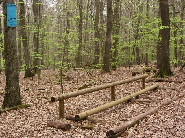 An Station 11 finden sich alte und neue Holzteile. Die alten Teile, welche auf dem Boden liegen, sind morsch und teilweise zerfallen. Sie stammen wahrscheinlich noch von der Erstausstattung des Trimmpfads. Ein Stück weiter wird eine Wegekreuzung überschritten, an der zahlreiche Wegweiser für Wanderer und Radfahrer zu finden sind. Auch auf einen vom Rhein-Main-Verkehrsverbund beschilderten Rundweg trifft man hier.