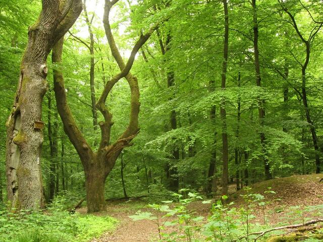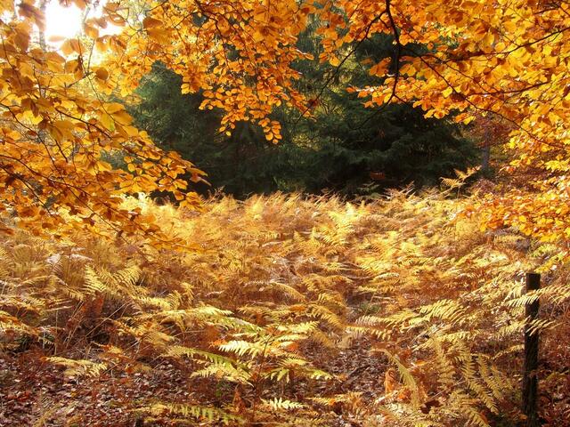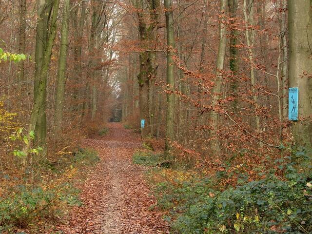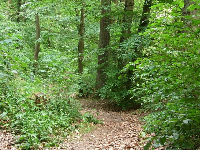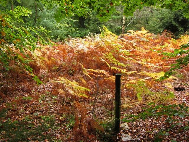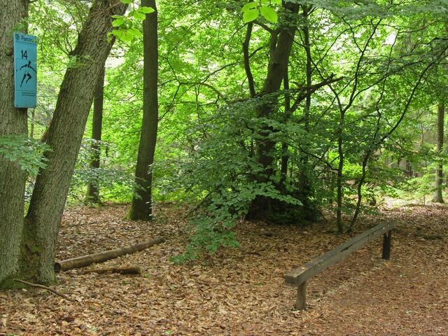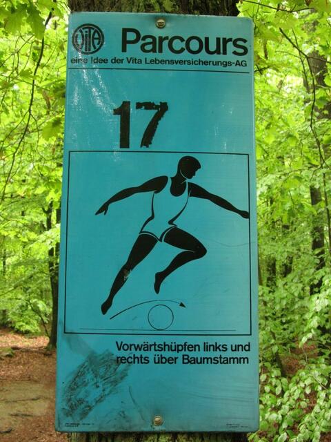 Auf dem Weg zur Station 17 kommt man an einigen schönen Adlerfarnen vorbei. Bei Station 17 gibt es eine seltsame Abweichung in der Ausstattung: Auf dem Schild ist die Übung "Vorwärtshüpfen links und rechts über Baumstamm" aufgeführt. Dies ist aber die Übung 14 - für Übung 17 sind Liegestützen vorgesehen. Das Gerät - ein Baumstamm - ist bei beiden Übungen gleich. Auf dem Schild ist auch nicht erkennbar, dass jemand die Nummer nachträglich verändert hat. Möglicherweise handelt es sich um einen Produktionsfehler.