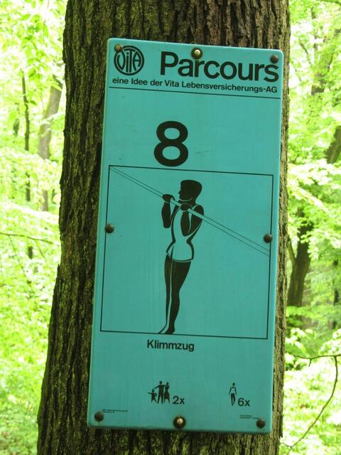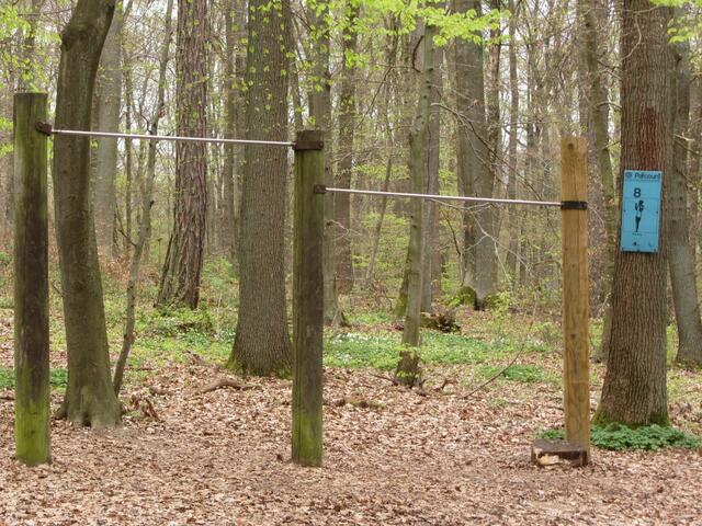 An Station 8 kann man Klimmzüge üben. In den letzten Monaten hat jemand des Gerät mit einer unüblichen Ausstattung in Form eines Boxsacks versehen, welcher an einer der Stangen für die Klimmzüge hängt.