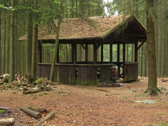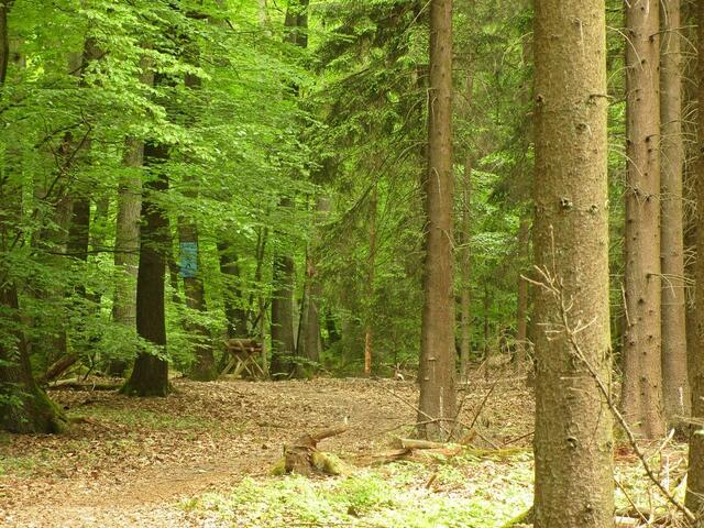 Bei Station 18 steht man am Waldrand in der Nähe einiger Gebäude. Das größte ist ein am Rande des Waldes stehendes Tagungshotel.