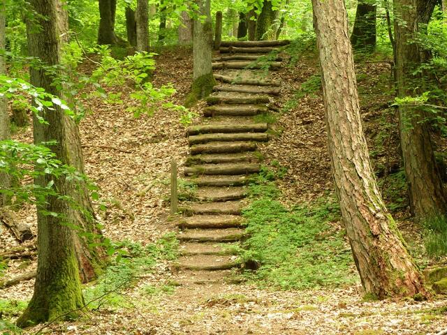 Nach Station 10 (Rumpfkreisen) folgt ein leider aufgegebenes Element des Trimmpfads in Form einer Treppe. Die Holzstufen, welche über einen Wall in den alten Steinbruch führen, sind noch vorhanden. Normalerweise sollte ein Wegweiser mit der Aufschrift "Gehen, Laufen oder Hüpfen" auf die Treppe verweisen. Möglicherweise wurde der Nutzer des Trimmpfads nach Überquerung des Erdwalls ebenerdig wieder zum Weg zurückgeführt.