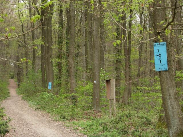 Der Weg verläuft ein Stück am Waldrand. Danach geht es nach Rechts in den Wald, wo sich in kurzen Abständen die ersten Übungsstationen befinden, welche lediglich aus Schildern mit Anleitungen zu Übungen bestehen. Daneben finden sich auch noch Schilder von einem Wald- und einem Vogellehrpfad, die sich ebenfalls in dem Waldgebiet befinden. Die Lehrpfade verlaufen teilweise auf dem Trimmpfad. Das erste Stück vom Trimmpfad gehört auch zum Waldlehrpfad, welcher an der Kreuzung vor Station 5 nach rechts abbiegt.