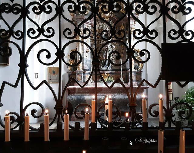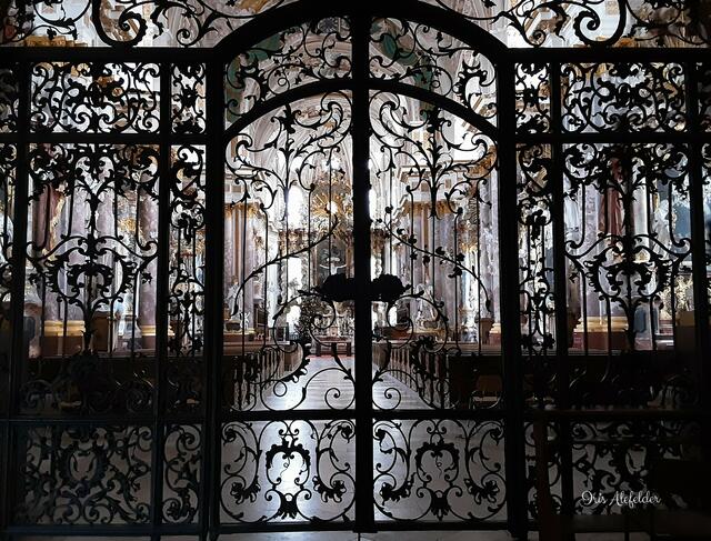 Der Innenraum der Kirche übertrifft, was sich von außen andeutet. Wer durch das Gitter eintritt und der überwältigenden Dimensionen gewahr wird, bleibt zunächst unwillkürlich stehen. Die üppige Ausstattung erscheint durch das reichlich einfallende Tageslicht in einem besonderen Glanz. Der Kirchenraum wirkt leicht und hell. Zusammen mit den vorherrschenden Pastelltönen und dem überall in der Kirche auf ockerfarbenem Grund schimmernden Blattgold entstehen immer wieder neue Lichteffekte und Schattierungen.