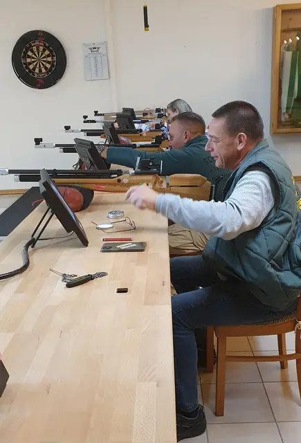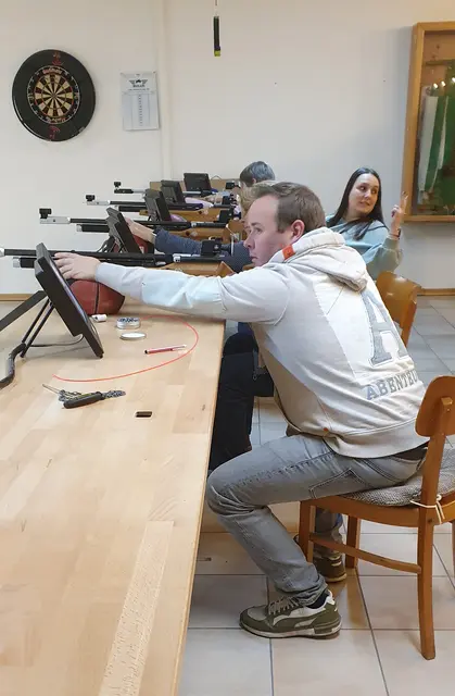 In lockerer Folge ging es zum Schießen; 10 Schuss mussten mit dem Luftgewehr unter der Aufsicht von Lea Bollhorst und Julia Wahl abgegeben werden; die Wertung erfolgte elektronisch, die Zehntelwertung. wurde nicht angezeigt.