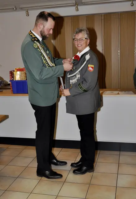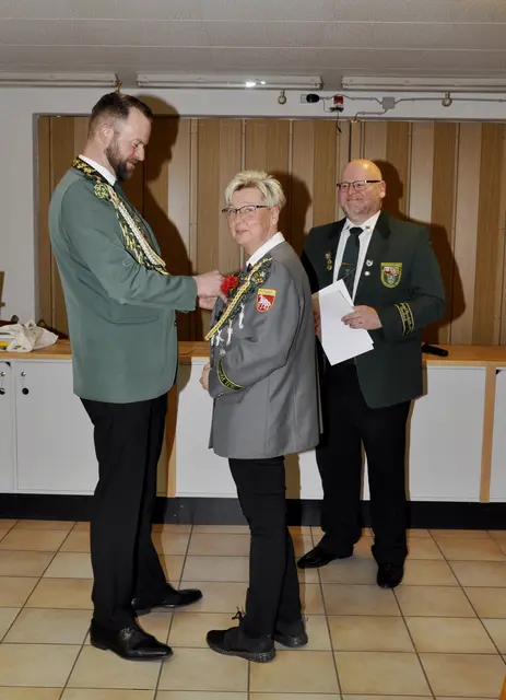Für Sigrid Spintge, Anja Bollhorst, Frank Weiß und Andreas Wichmann gibt es eine Ehrung auf dem Kreisschützentag. Fabian Feise und Dennis Lehmann nahmen dann noch eine besondere Ehrung vor: die silberne Präsidentennadel für besondere Verdienste als Vorsitzender an Bert Freund.