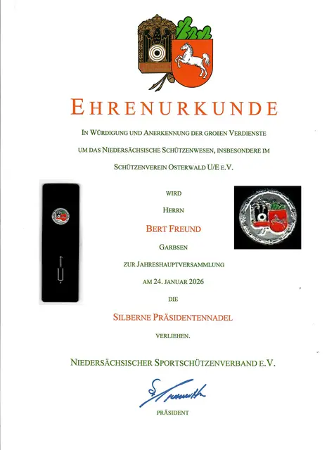 Am Samstag, 24. Januar 2026 eröffnete. der 1. Vorsitzende Bert Freund im Schießsportcenter des Schützenvereins Osterwald Unterende „Zum Jagdschloss“ die Versammlung pünktlich um 19.30 Uhr. Als 1. begrüßte er den Ortsbürgermeister Norbert Gehrke und den Vertreter des Kreisschützenverbandes Neustadt, Jens Stuhlemmer. Danach bedankte er sich bei den Mitgliedern, die einen Teil der Getränke spendeten ( König Andreas Wichmann), bei allen die bei verschiedenen Veranstaltungen zur Verfügung standen sowie bei Vanessa am Tresen.