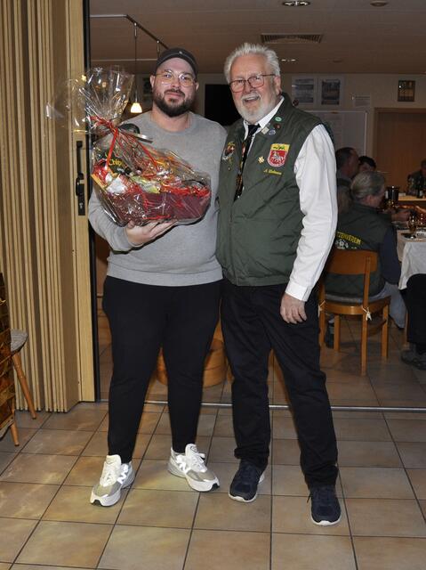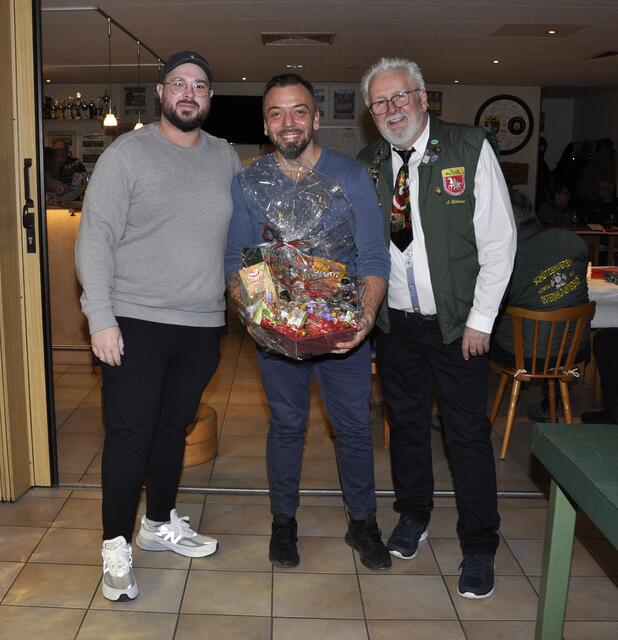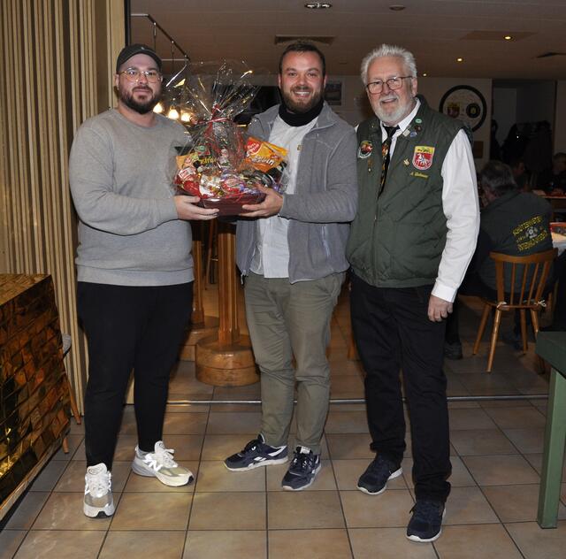 Zum Abschluss überreichte die Herrenabteilung den „Runden Geburtstagskindern“ bei den aktiven Schützen im Jahre 2024 einen Präsentkorb: Dennis Lehmann, Lennart Gieselmann, Phillip Bonnes.