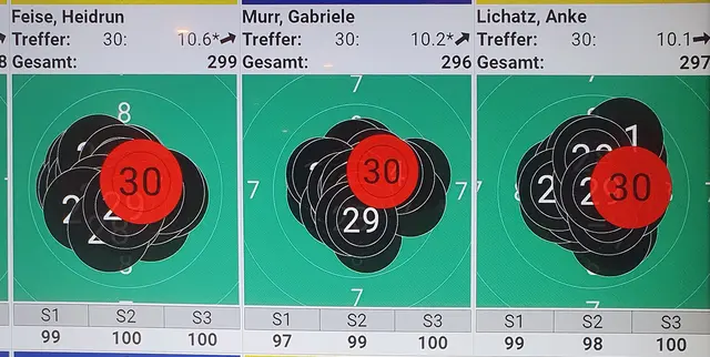 Im 2. Kampf des Tages gegen die Mannschaft von SV Westen gab es ebenfalls einen Sieg. Heidrun Feise siegte mit 299 Ring zu 295 Ring, Gabriele Murr gewann mit 296 Ring zu 292 Ring. Anke Lichatz verlor mit 294 Ring zu 295 Ring.)