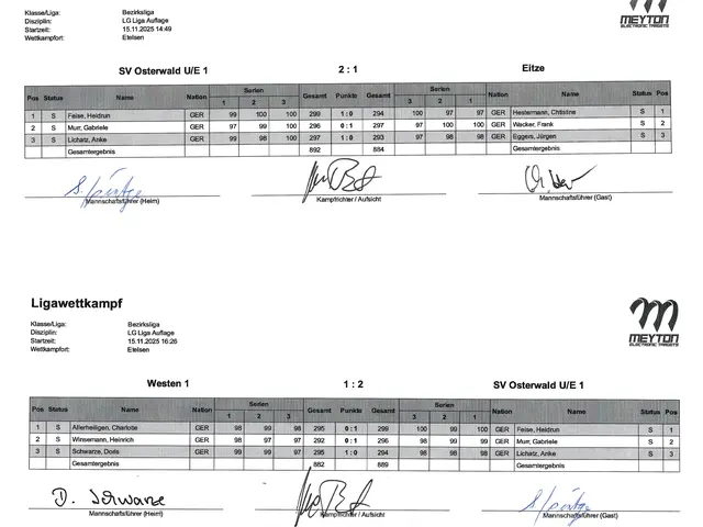 Am 15.11.2025 . dem 3. Wettkampftag, starteten Gabriele Murr, Anke Lichatz und Heidrun Feise in Etelsen im 1. Kampf gegen die Mannschaft vom SV Eitze mit einem Sieg. Heidrun Feise siegte mit 299 Ring zu 294 Ring, Gabriele Murr verlor mit 296 Ring zu 297 Ring. Anke Lichatz gewann mit 297 Ring zu 293 Ring.