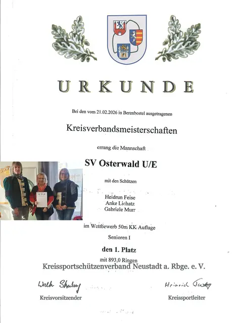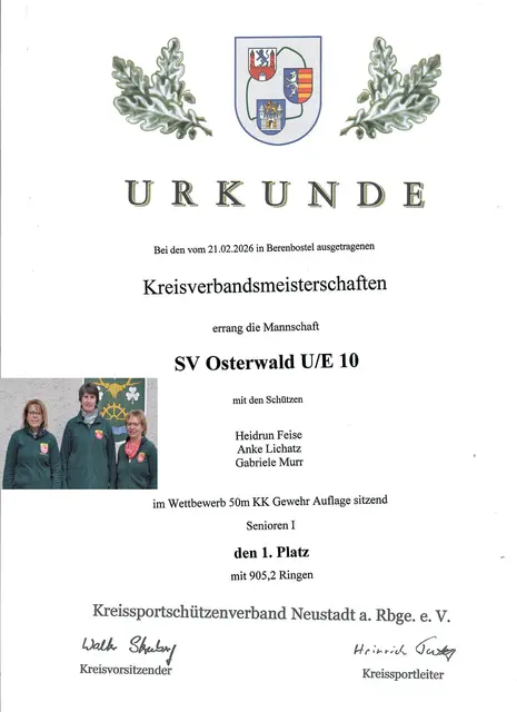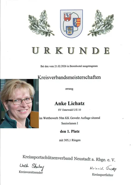 Die Kreismeisterschaften 2026 des Kreissportschützenverbandes Neustadt starteten am 21.02.2026 im Schützenhaus des SV Berenbostel. Der Schützenverein Osterwald Unterende hatte 4 Schützen und 5 Schützinnen am Start, das war etwas besser als 2025. Ziel eines jeden Schützen/in sollte es sein bei weiterführenden Disziplinen ein Ergebnis zu erzielen, das eine eventuelle Qualifikation zur Landesmeisterschaft verspricht. Wenn dabei ein Kreismeistertitel herausspringt umso besser.