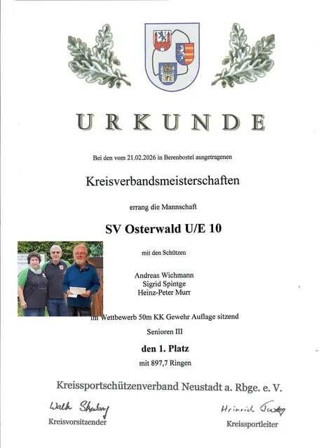 Bei den Senioren III wurde die Mannschaft mit Sigrid Spintge, Heinz Peter Murr, Andreas Wichmann ebenfalls Kreismeister mit 897,7 Ring.