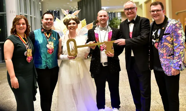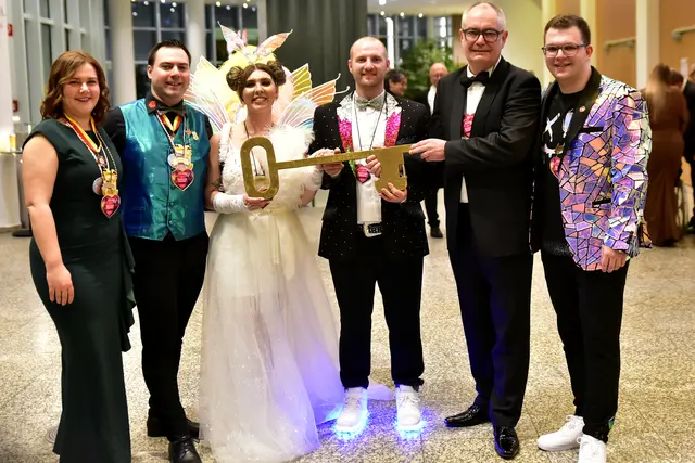 Am Beginn der Gala stand erst einmal die Übergabe der Rathausschlüssel. Gersthofens Bürgermeister Michael Wörle überreichte den überdimensionalen Schlüssel Prinzessin Selina I. mit dem Hinweis, dass das Prinzenpaar bereits seit dem 11.11. regiere. So könne er sich jetzt schon daran gewöhnen, wie es ab März sein werde, wenn er sein Amt als Bürgermeister abgeben werde. Anschließend schritt das Prinzenpaar gleich zu seiner ersten Amtshandlung und verkündete einen königlichen Erlass. Als Erstes legten Selina I. und Matthias II. fest, dass die verschiedenen Parteien, die im Gersthofer Rathaus vertreten sind, im Laufe des Abends Dienst in der Bar in der Stadthalle zu verrichten hätten, um dort einen eigens kreierten Cocktail auszuschenken.