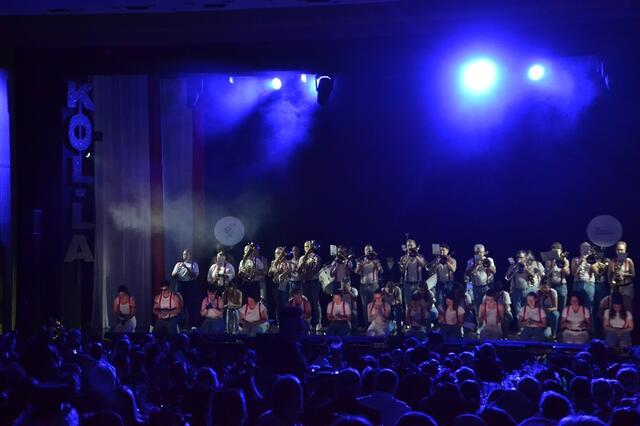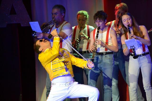 Dieses Jahr stand der Auftritt der Blasharmoniker unter dem Motto „Queen“. Eingeleitet vom typischen Stampfen und Klatschen bei We will rock you auf der dunklen Bühne riss die Musik der Blasharmoniker zusammen mit den Lichteffekten das Publikum mit – und die Halle kochte, als sich mitten im langsamen Teil der Bohemian Rhapsody der Vorhang aus Musikern zur Seite schob und den Blick auf Freddie Mercury freigab. Keine Frage: Mit gut 50 Musikern boten die Blasharmoniker nicht nur hörbar, sondern auch optisch eine beeindruckende Performance.